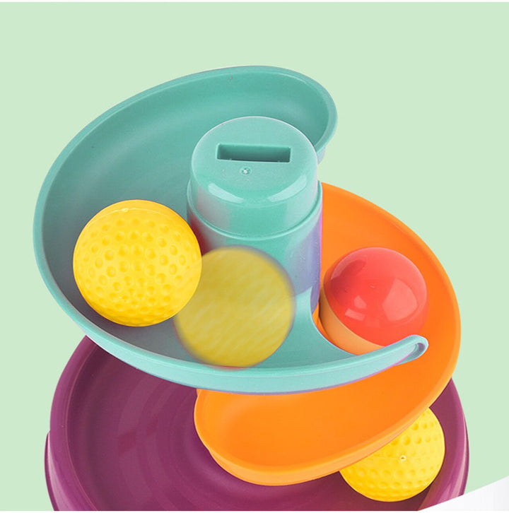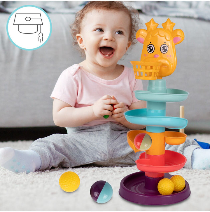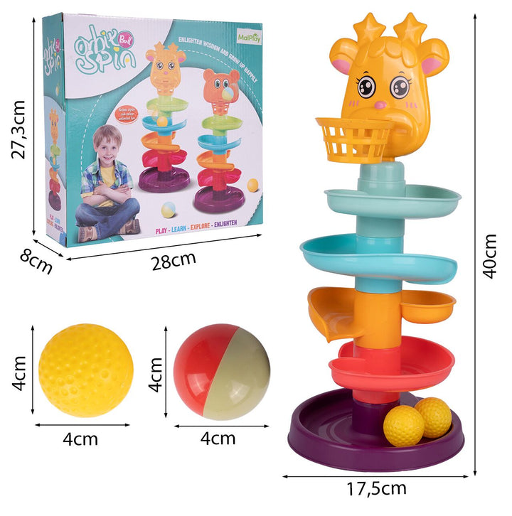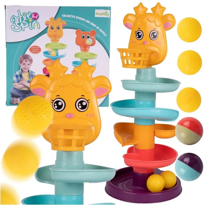 الطفل بيحط الكور من أعلى (سلة الجيراف) وتبدأ الكور تتدحرج وتنزل في مسار حلزوني لحد ما توصل للقاع – ومع كل لفة الكورة بتصدر صوت خفيف بيشجّع الطفل يكمل اللعب.