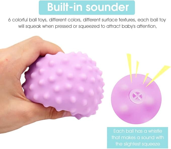 🎨 ملمس وألوان متنوعة: 6 كرات مختلفة، كل واحدة بتصميم مختلف علشان تنمي حاسة اللمس عند الطفل.