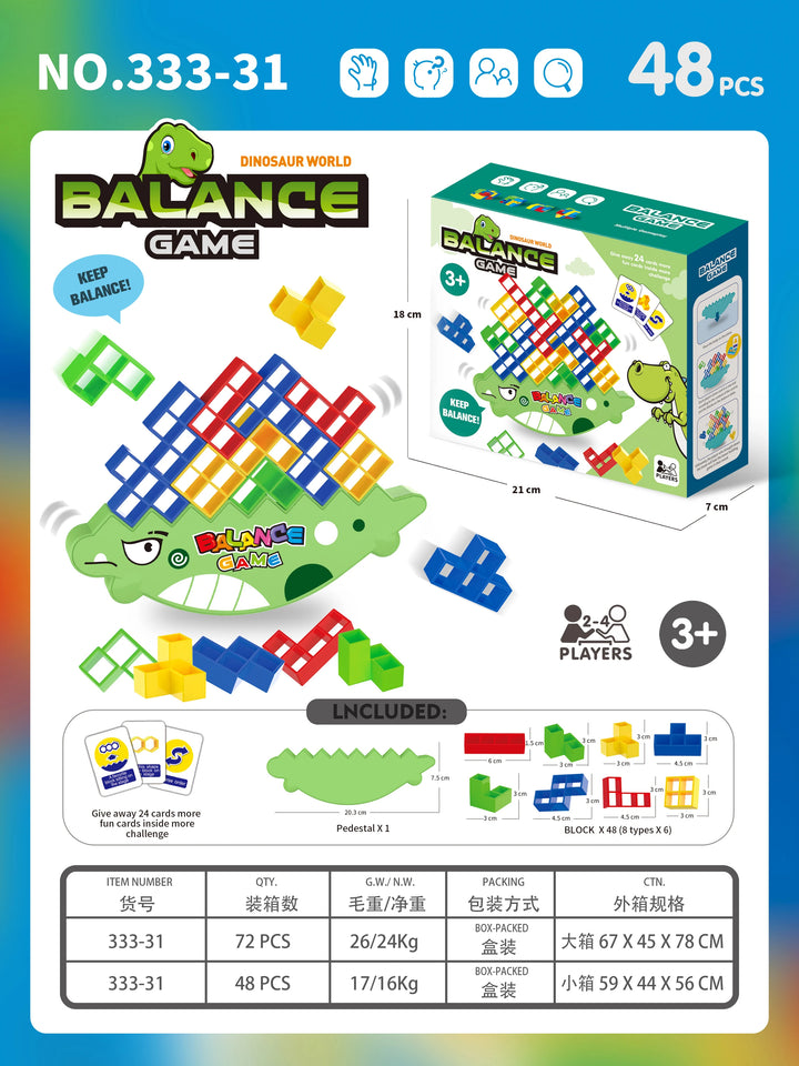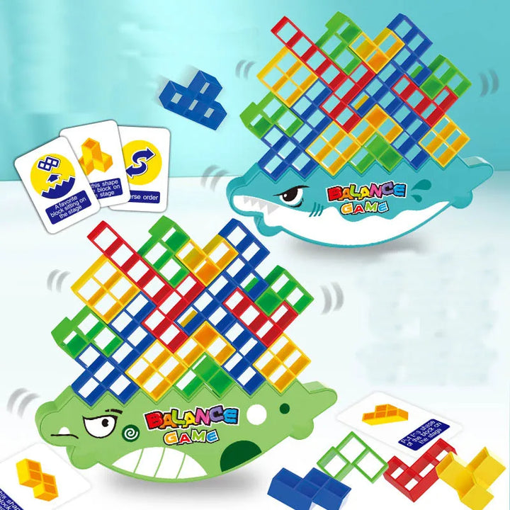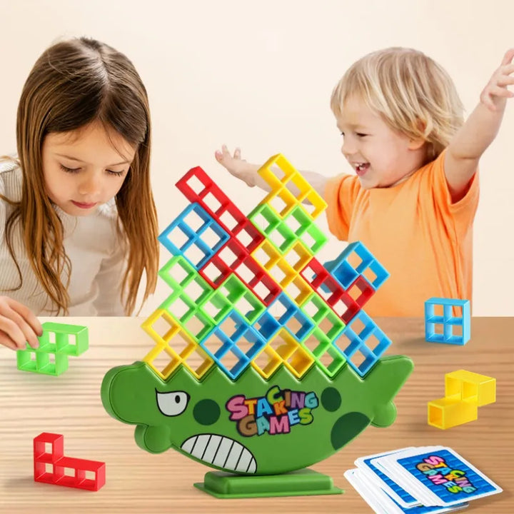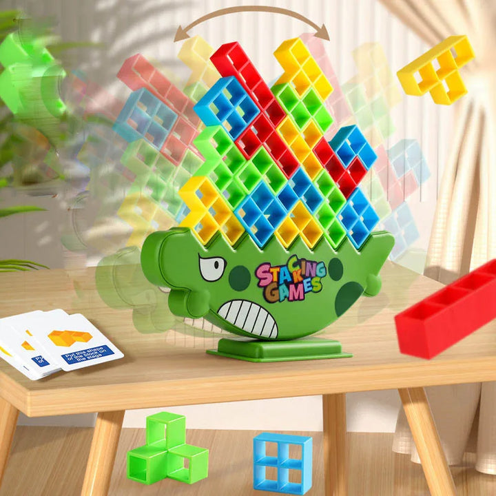 الطفل (أو الفريق) بيحاول يرُص القطع التتريس المختلفة فوق قاعدة التمساح 🐊 من غير ما يفقد التوازن. اللعبة شكلها بسيط لكن محتاجة تركيز وصبر وخطة عشان تكسب.