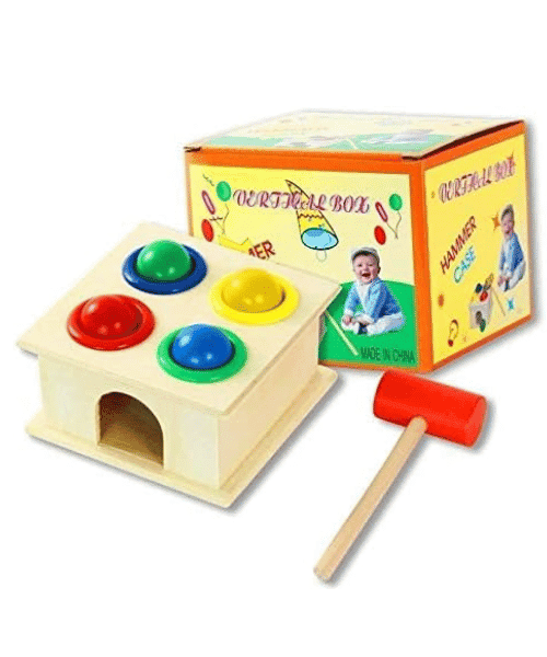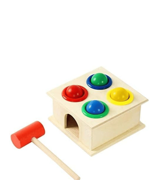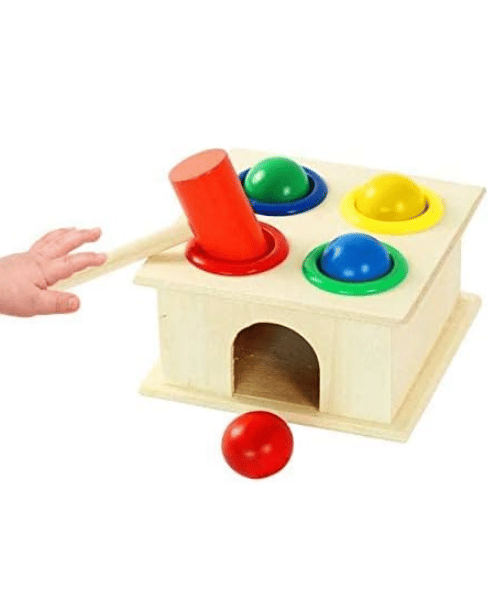 يضع الطفل الكرة في إحدى الفتحات العلوية، ثم يستخدم الشاكوش لضربها بلطف، مما يجعلها تنزلق وتخرج من الفتحة الأمامية، مما يخلق تجربة ممتعة تساعد في تطوير التنسيق الحركي والبصري.