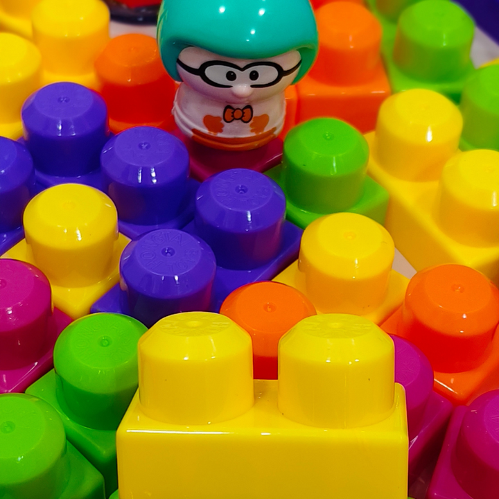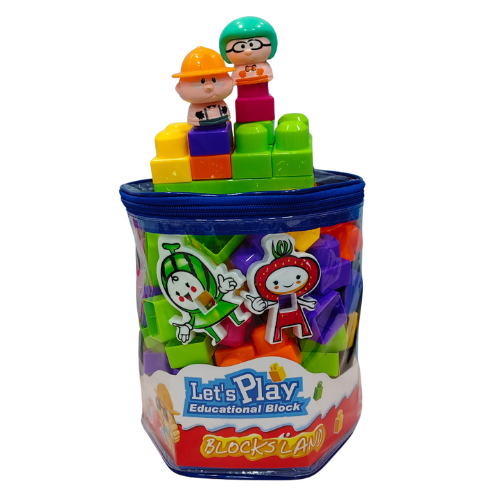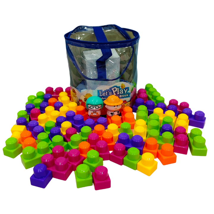الشنطة بتحتوي على 80 مكعب ملون بحجم كبير مناسب للأطفال الصغيرين، ومعاها شخصيتين ظراف يضيفوا جو من المرح والتفاعل. المكعبات سهلة المسك والتركيب، وبتساعد الطفل يكوّن أشكال ومجسمات مختلفة.