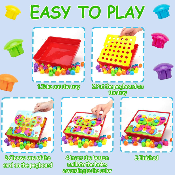 الطفل بيختار لوحة من بين 12 لوحة كرتونية ملونة، ويبدأ يركّب الأزرار الكبيرة على الأماكن الفارغة عشان يكوّن الشكل بالكامل (ديناصور 🦖، فراشة 🦋، قارب ⛵، دب 🐻 … وغيرها).