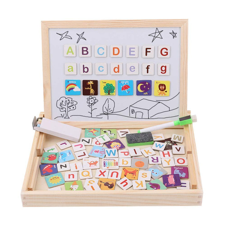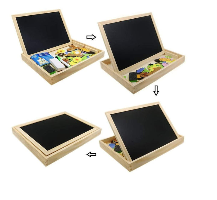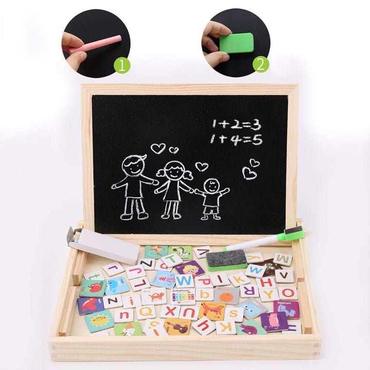 تحتوي على وجه أبيض مغناطيسي للكتابة بالقلم الماركر ولصق الحروف والصور، ووجه أسود للكتابة بالطباشير.