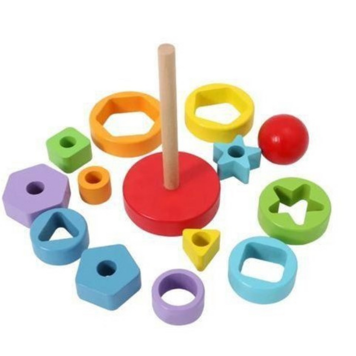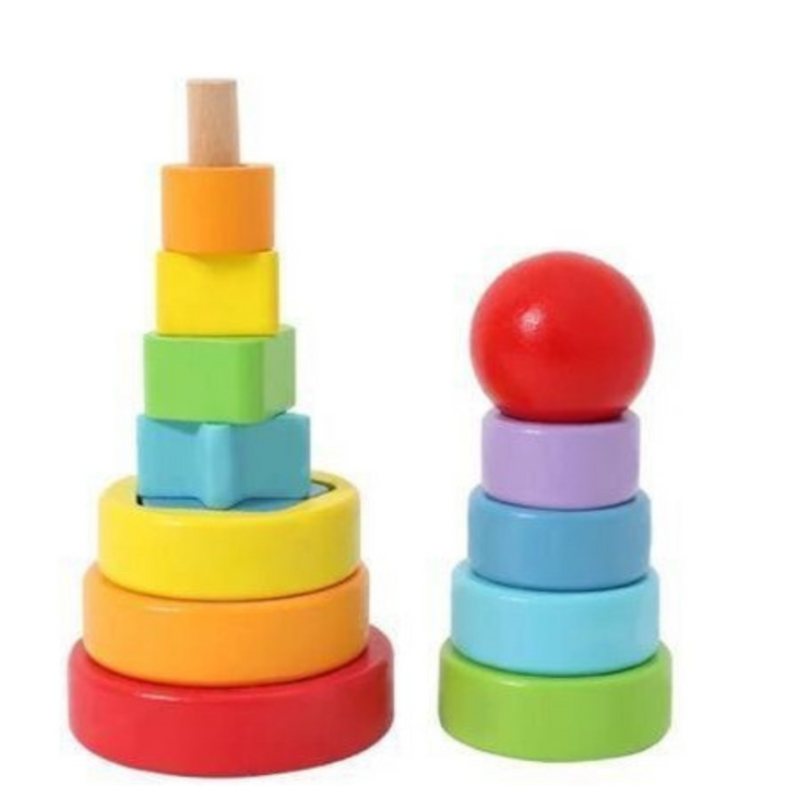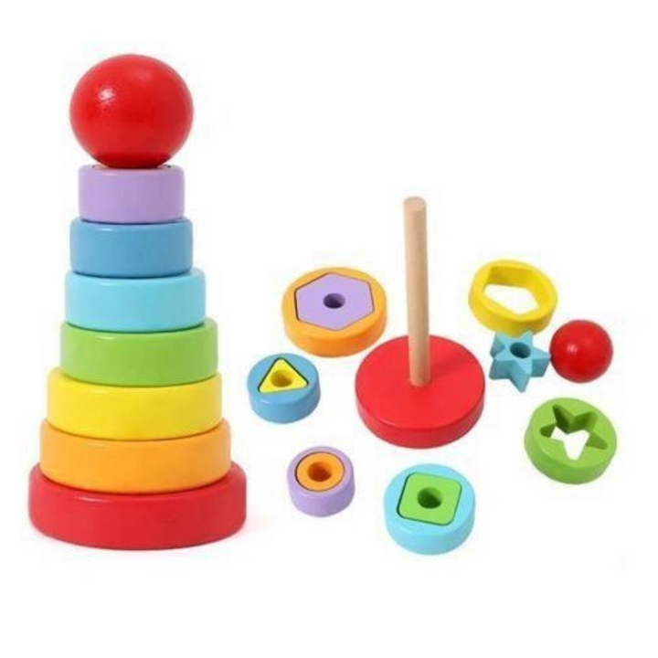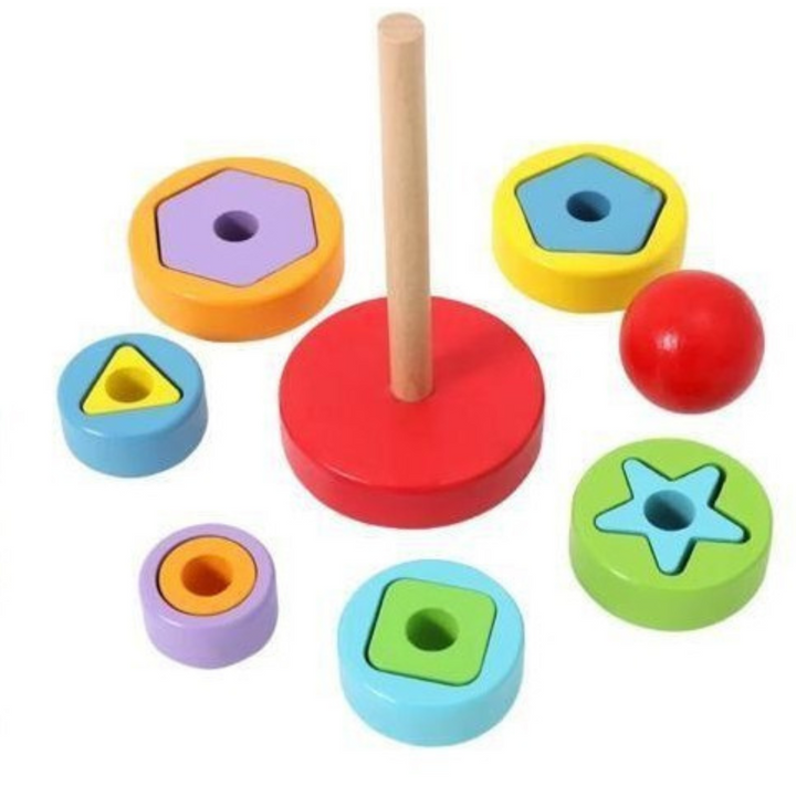 خلي طفلك يتعلم الأحجام والأشكال والألوان بطريقة عملية وممتعة مع برج الحلقات الهندسية الخشبي!