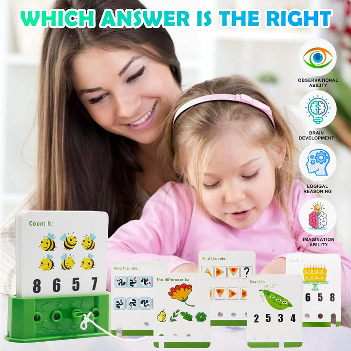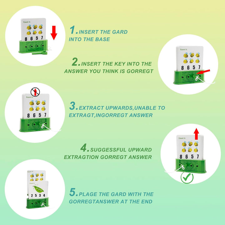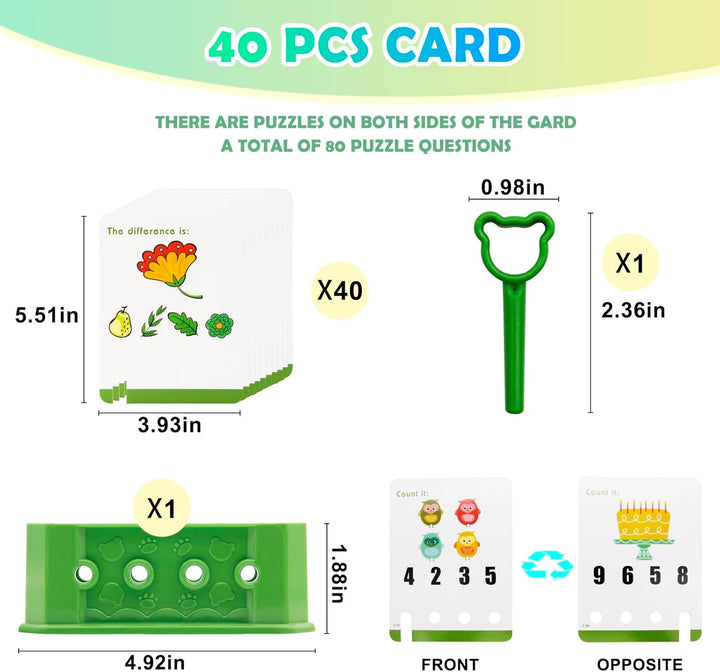 الطفل بيختار كارت من الكروت (40 كارت = 80 تحدي)، يشوف السؤال، ويحط المفتاح في المكان اللي شايفه صح… ويشد الكارت بنفسه. لو إجابته صح، الكارت بيطلع فورًا ✅ وده بيديله إحساس إنجاز حقيقي. لو غلط ❌ الكارت يفضل ثابت، وده بيحفّزه يفكر تاني ويجرّب.