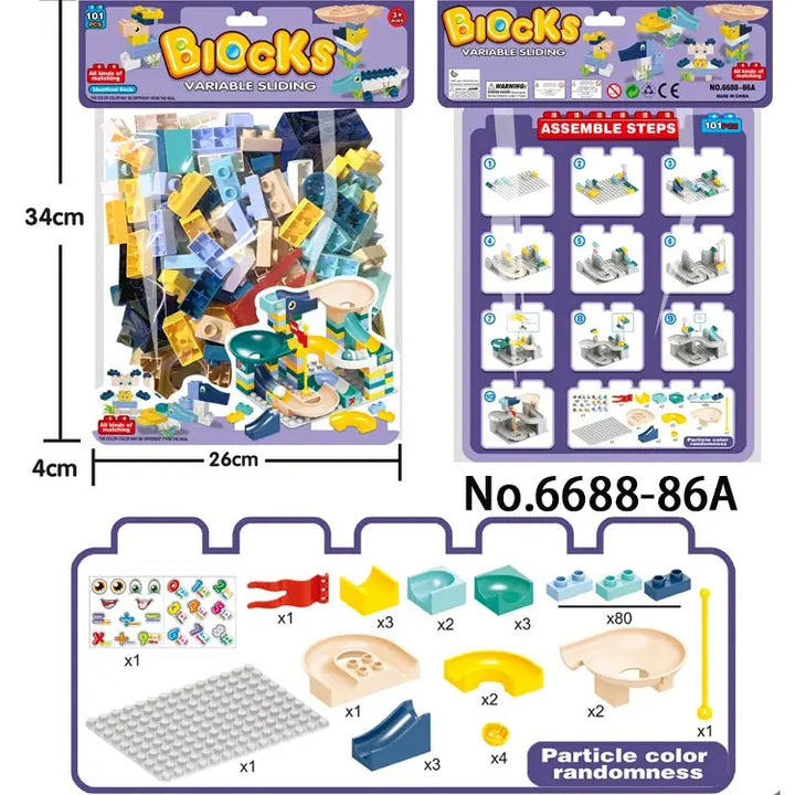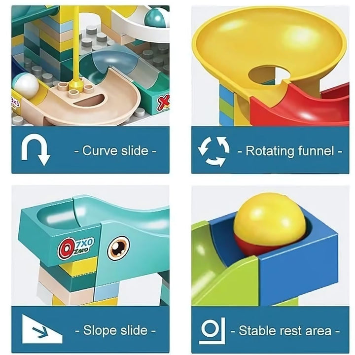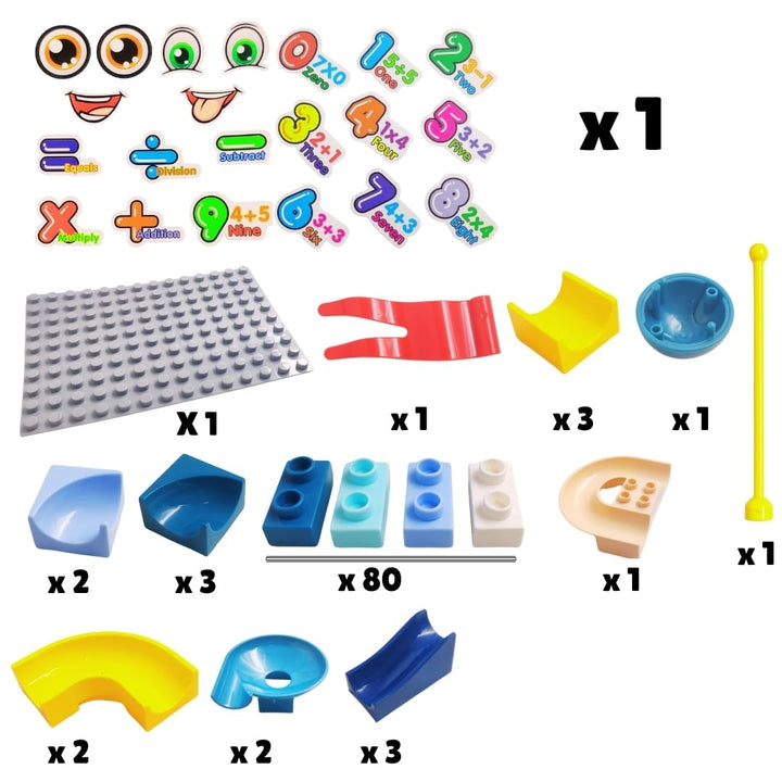 اللعبة عبارة عن 101 قطعة تركيب متنوعة بيقدر الطفل يبني بيها مسارات مختلفة للكرات، ويشوف بنفسه إزاي الكرات بتتحرك بفعل الجاذبية والانحدار.