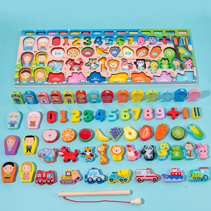 البورد فيه أرقام، أشكال، شخصيات، وحيوانات بألوان زاهية، ومعاهم لعبة صيد الأسماك المغناطيسية اللي بتدي للطفل تجربة لعب مشوقة.