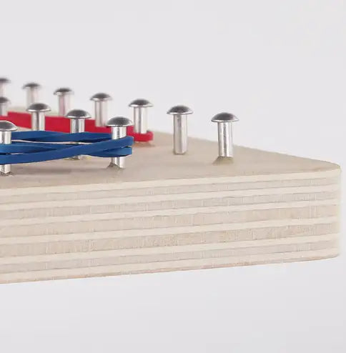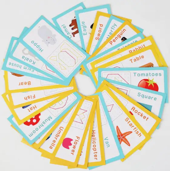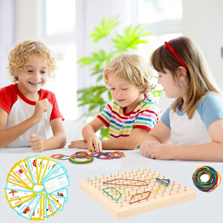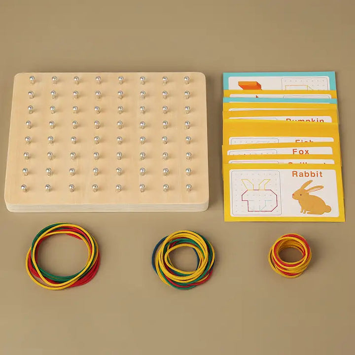لوحة تعليمية ممتعة للأطفال من عمر 3 سنوات، بتتكون من لوح خشبي عليه دبابيس معدنية وكروت أنشطة، والطفل بيستخدم الاساتك الملونة عشان يرسم أشكال ورسومات زي الأرنب، السمكة، القارب… وغيرها. لعبة مثالية لدمج المتعة بالتعلم وتنمية الإبداع.